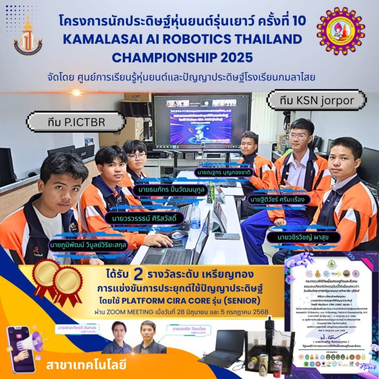 ขอแสดงความยินดี กับนักเรียนและครูที่ปรึกษาโครงงานได้รับรางวัลระดับเหรียญทอง การประยุกต์ใช้ปัญญาประดิษฐ์โดยใช้ Platform CiRA CORE รุ่น Senior โครงการนักประดิษฐ์หุ่นยนต์รุ่นเยาว์ การแข่งขันสิ่งประดิษฐ์ หุ่นยนต์ ปัญญาประดิษฐ์และเทคโนโลยี (Kamalasai AI Robotics and Technology Thailand championship #10) 10 กรกฎาคม 2025 Read More »