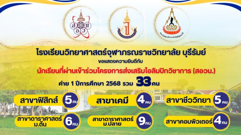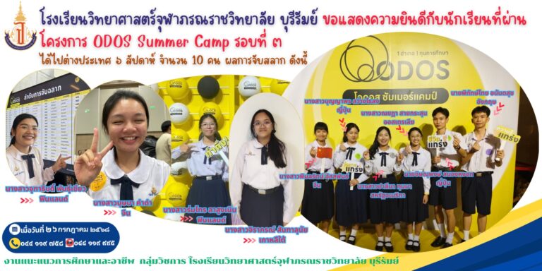 ขอแสดงความยินดีกับนักเรียน โรงเรียนวิทยาศาสตร์จุฬาภรณราชวิทยาลัย บุรีรัมย์ ในโอกาสจับสลากเลือกประเทศ เข้าร่วมโครงการ ODOS Summer Camp 6 สัปดาห์ ในประเทศต่างๆ จำนวน 10 คน 27 กรกฎาคม 2025 Read More »