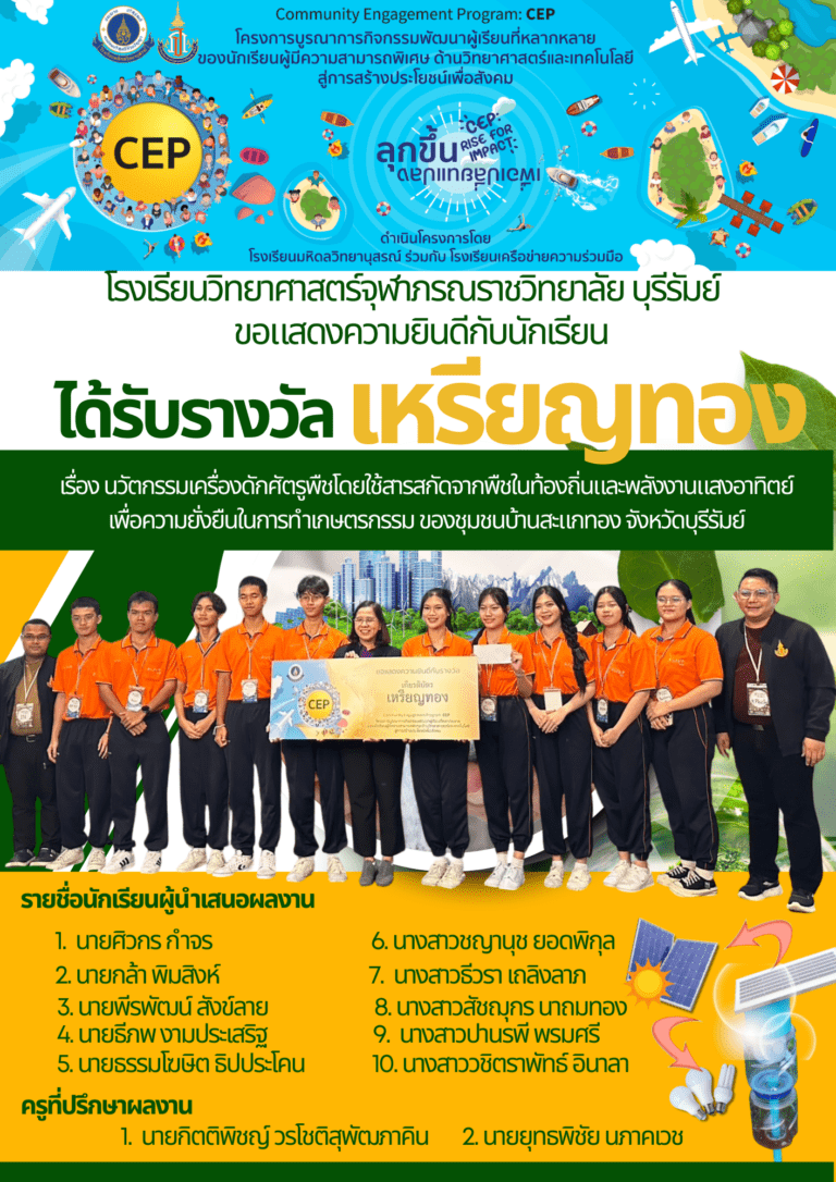 ขอแสดงความยินดีกับนักเรียนผู้นำเสนอผลงาน ได้รับรางวัลเหรียญทอง จากกิจกรรม “โครงการบูรณาการกิจกรรมพัฒนาผู้เรียนที่หลากหลายของนักเรียนผู้มีความสามารถพิเศษ ด้านวิทยาศาสตร์และเทคโนโลยีสู่การสร้างประโยชน์เพื่อสังคม : Community Engagement Program (CEP)” ในปีงบประมาณ พ.ศ. 2568 15 กันยายน 2025 Read More »