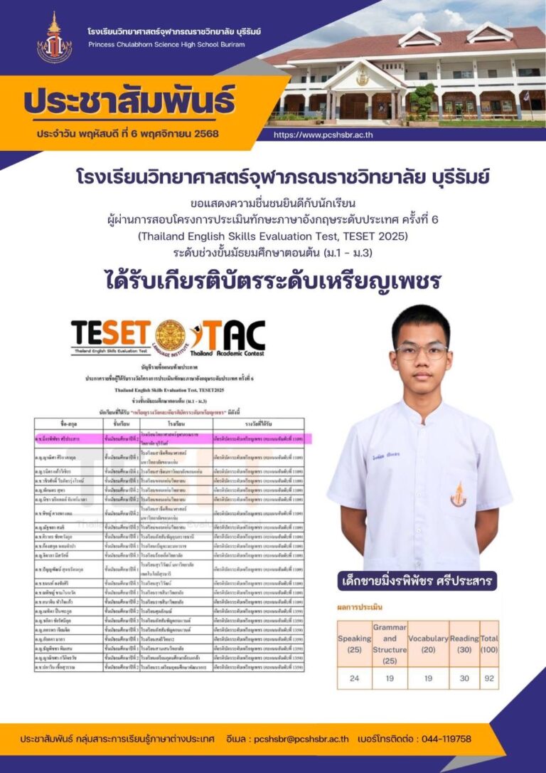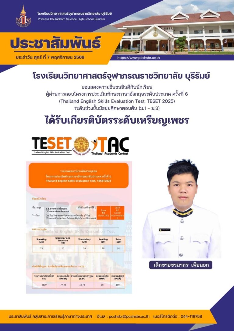 ขอแสดงความยินดีกับ เด็กชายชวนากร เพียนอก นักเรียนชั้นมัธยมศึกษาปีที่ 3/3 ได้รับเกียรติบัตรระดับเพชร การสอบโครงการประเมินทักษะภาษาอังกฤษระดับประเทศ Thailand English Skills Evaluation test, TESET 2025 6 พฤศจิกายน 2025 Read More »