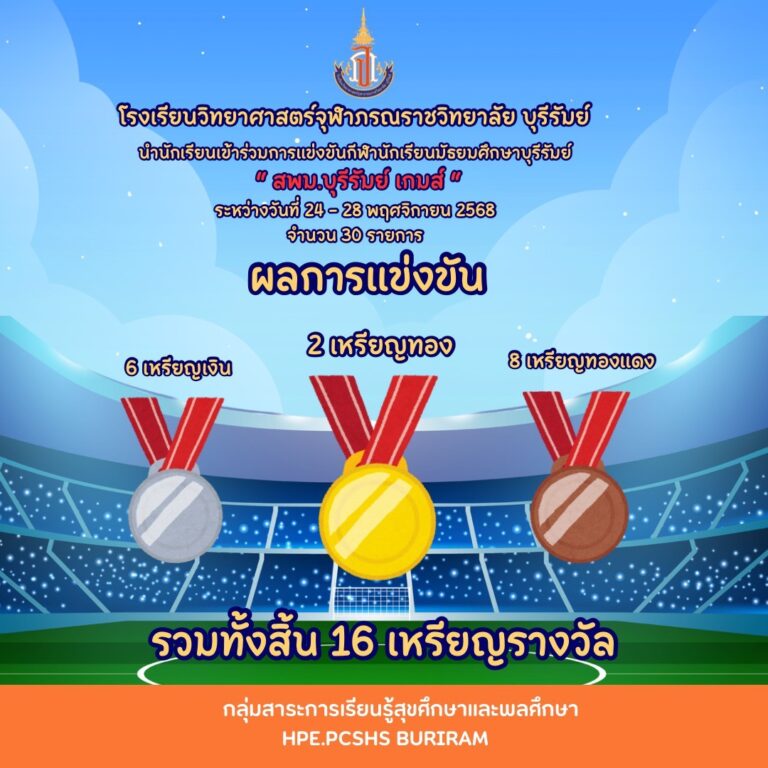 ขอแสดงความยินดีกับนักเรียน ที่เข้าร่วมการแข่งขันกีฬานักเรียนมัธยมศึกษาบุรีรัมย์ (สพม.บุรีรัมย์เกมส์) ได้รับรางวัล รวม 16 เหรียญรางวัล 28 พฤศจิกายน 2025 Read More »