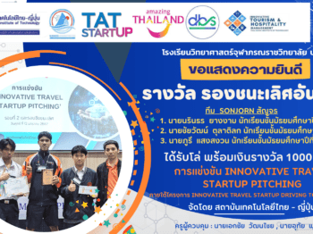 ขอแสดงความยินกับนักเรียนที่ได้รับรางวัลรองชนะเลิศอันดับ 2 รับโล่พร้อมเงินรางวัล ในการแข่งขัน Innovative Travel Startup Pitching จัดโดย สถาบันเทคโนโลยีไทย – ญี่ปุ่น