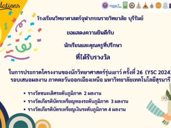 ขอแสดงความยินดี กับนักเรียนและครูที่ปรึกษา ที่ได้รับรางวัลในการเข้าร่วมประกวดโครงงานของนักวิทยาศาสตร์รุ่นเยาว์ ครั้งที่ 26 (Young Scientist Competition: YSC 2024) รอบชิงชนะเลิศระดับภูมิภาคตะวันออกเฉียงเหนือ