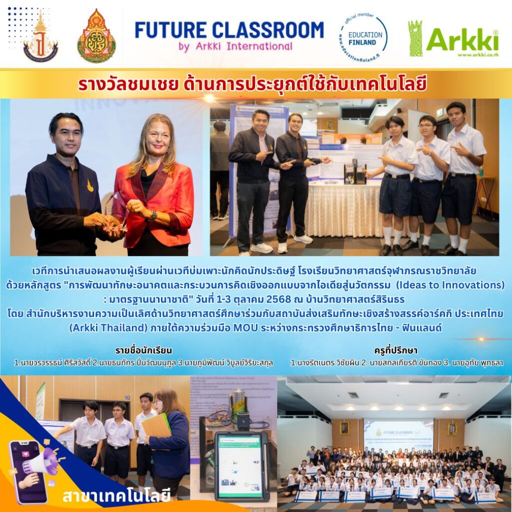Dr. Annika Vatanen ที่ปรึกษาด้านการศึกษา สถานเอกอัครราชทูตฟินแลนด์ประจำประเทศไทย มอบโล่รางวัลและเกียรติบัตร การเข้าร่วมกิจกรรมเวทีการนำเสนอผลงานผู้เรียนผ่านเวทีบ่มเพาะนักคิดนักประดิษฐ์ โรงเรียนวิทยาศาสตร์จุฬาภรณราชวิทยาลัย ด้วยหลักสูตร “การพัฒนาทักษะอนาคตและกระบวนการคิดเชิงออกแบบจากไอเดียสู่นวัตกรรม (Ideas to Innovations) : มาตรฐานนานาชาติ” ระหว่างวันที่ 1-3 ตุลาคม 2568 ณ บ้านวิทยาศาสตร์สิรินธร โดย สำนักบริหารงานความเป็นเลิศด้านวิทยาศาสตร์ศึกษาร่วมกับสถาบันส่งเสริมทักษะเชิงสร้างสรรค์อาร์คกิ ประเทศไทย (Arkki Thailand) ภายใต้ความร่วมมือ MOU ระหว่างกระทรวงศึกษาธิการไทย – ฟินแลนด์