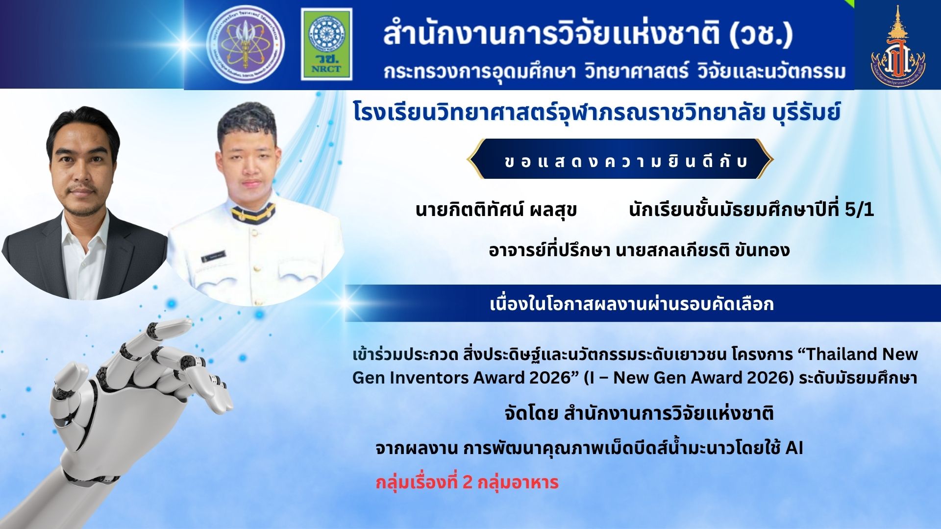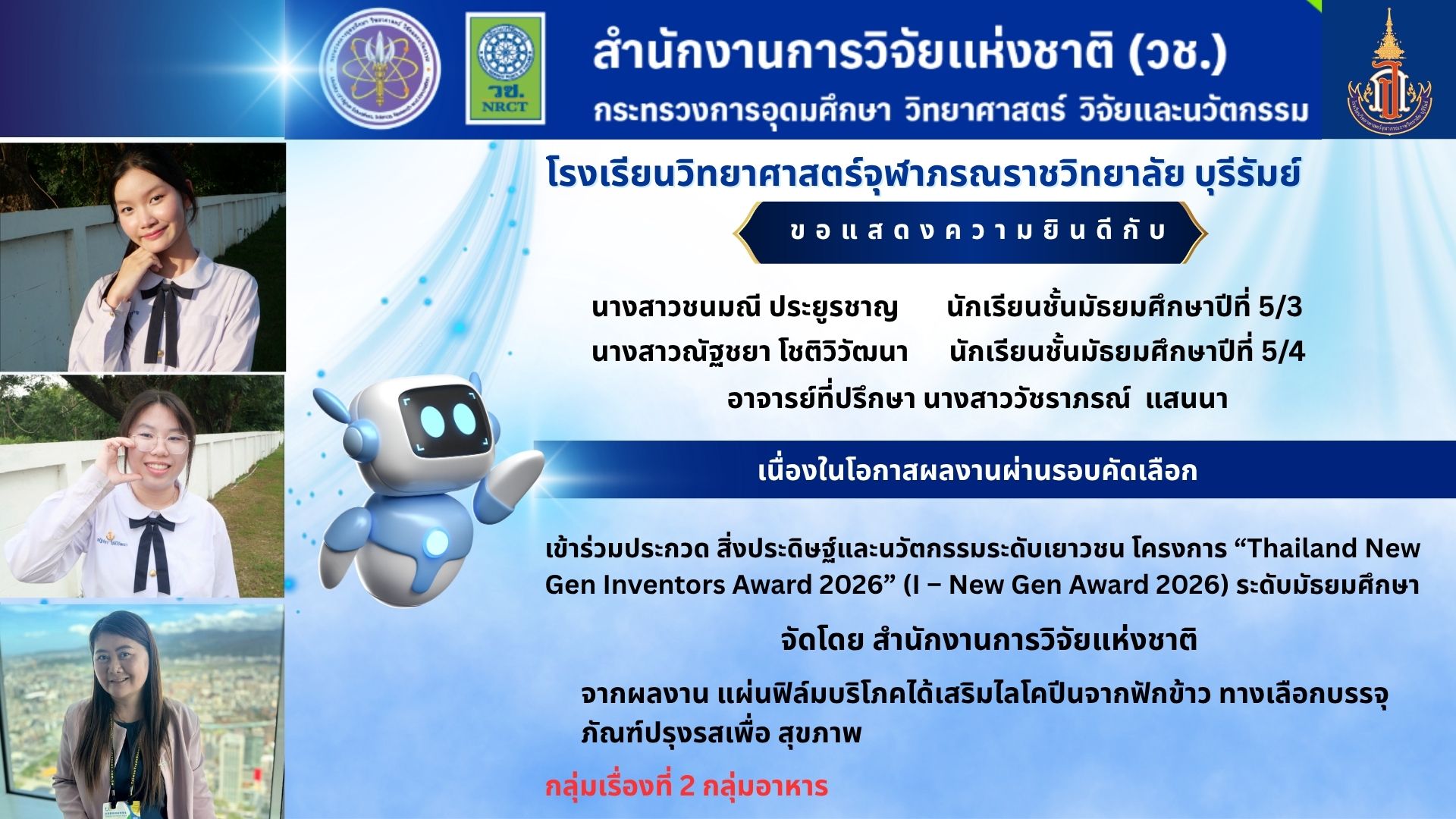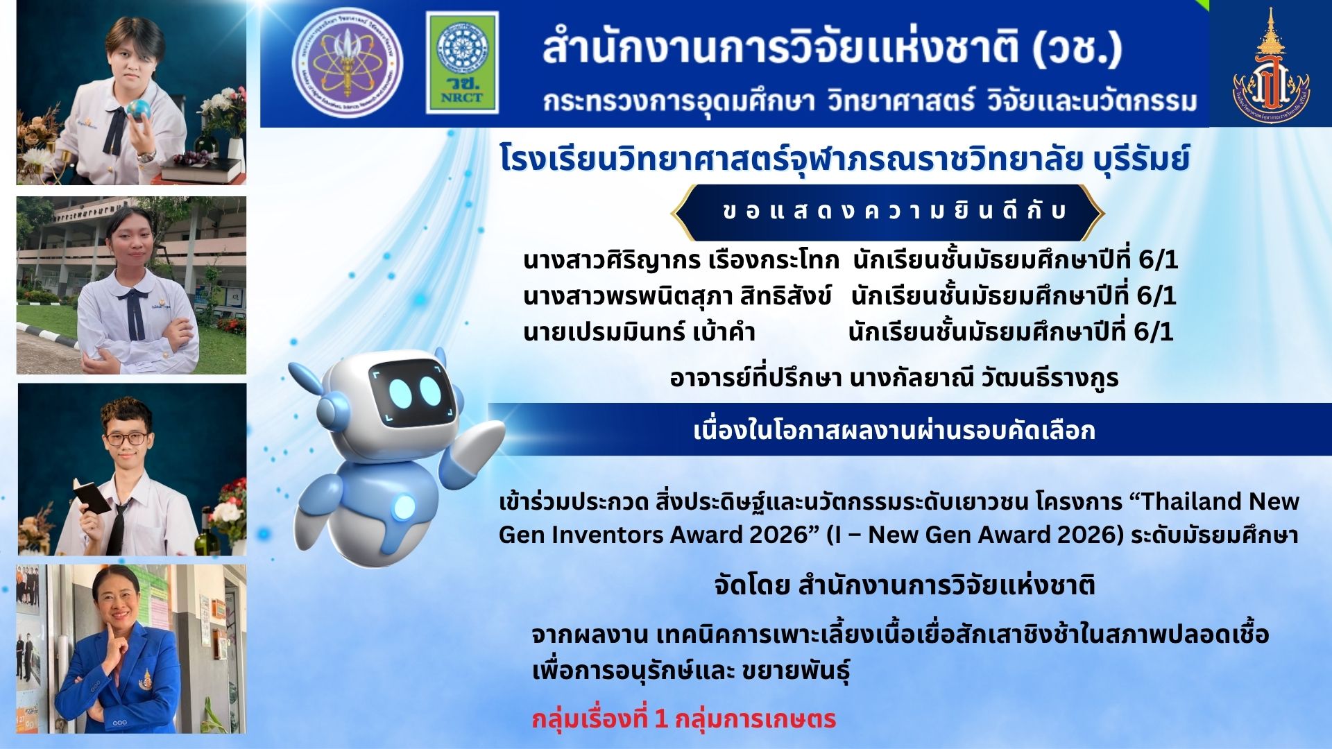 ขอแสดงความยินดีกับนักเรียนและคุณครูที่ปรึกษา เนื่องในโอกาสผลงานผ่านการพิจารณาเข้าร่วมประกวดเวทีสิ่งประดิษฐ์และนวัตกรรมระดับเยาวชนโครงการ “Thailand New Gen Inventors Award 2026” (I – New Gen Award 2026) ระดับมัธยมศึกษา