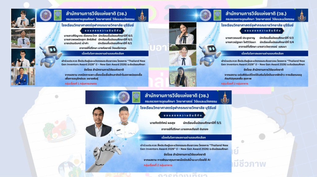 กลุ่มสาระการเรียนรู้วิทยาศาสตร์และเทคโนโลยี ขอแสดงความยินดีกับนักเรียนและคุณครูที่ปรึกษาเนื่องในโอกาสผลงานผ่านการพิจารณาเข้าร่วมประกวดเวทีสิ่งประดิษฐ์และนวัตกรรมระดับเยาวชนโครงการ “Thailand New Gen Inventors Award 2026” (I – New Gen Award 2026) ระดับมัธยมศึกษา โดยจะเข้าร่วมประกวด (รอบตัดสิน) ในงาน “วันนักประดิษฐ์”ประจําปี 2569 ระหว่างวันที่ 5 – 9 มกราคม 2569 ณ EVENT HALL 100 – 104 ศูนย์นิทรรศการและการประชุมไบเทค บางนา กรุงเทพฯ จำนวน 3 ผลงาน