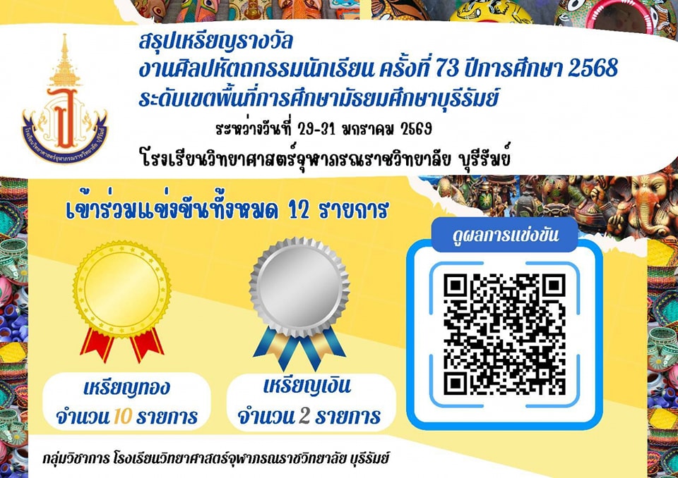 สรุปผลการแข่งขันศิลปหัตถกรรม ครั้งที่ 73 ปีการศึกษา 2568 ณ สำนักงานเขตพื้นที่การศึกษามัธยมศึกษา บุรีรัมย์ ระหว่างวันที่ 29-31 มกราคม 2569 โรงเรียนวิทยาศาสตร์จุฬาภรณราชวิทยาลัย บุรีรัมย์ ส่งเข้าร่วมแข่งขันทั้งหมด 12 รายการ